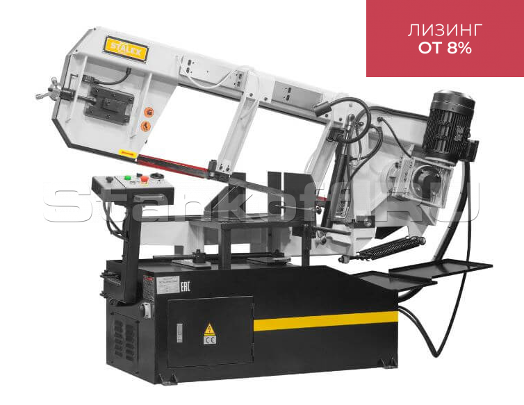 Stalex BS-2114ТН с гидроподъёмом рамы, оборудован дросселируемым гидравлическим цилиндром, обеспечивающим скорость опускания пильной рамы в зависимости от профиля заготовки, с оптимальными режимами распила, подъём рамы производится гидравлической системой (автоматически) после опускания пилы в крайнюю нижнюю точку и отключения. Разработан для резки черных металлов и других материалов с полым или профильным сечением, конструкция позволяет делать макс. распилы полых заготовок (труб) диаметром до 400мм, и профиля до 550х360мм, с поворотом рамы в одну сторону 0 …+45° …+60°.