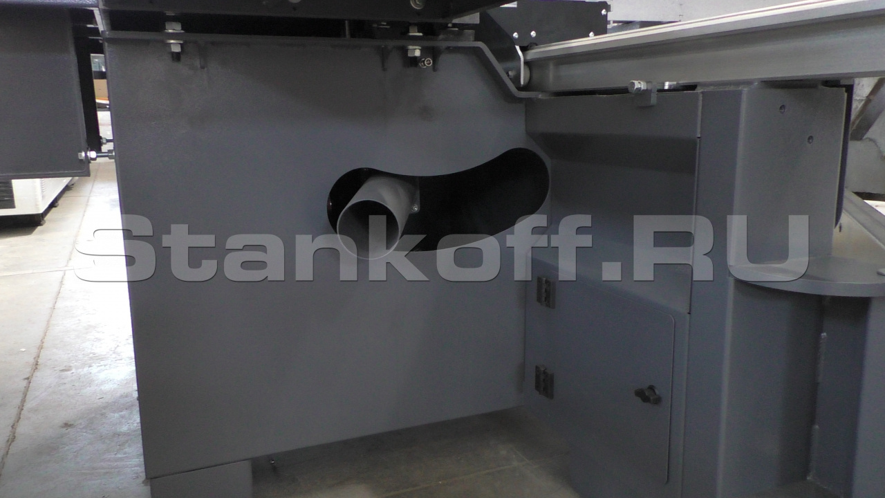 Защитный кожух обеспечивает визуальный контроль распила, а также прекрасное удаление опилок из зоны резания. Основной патрубок для удаления опилок находится в моторном отсеке.
