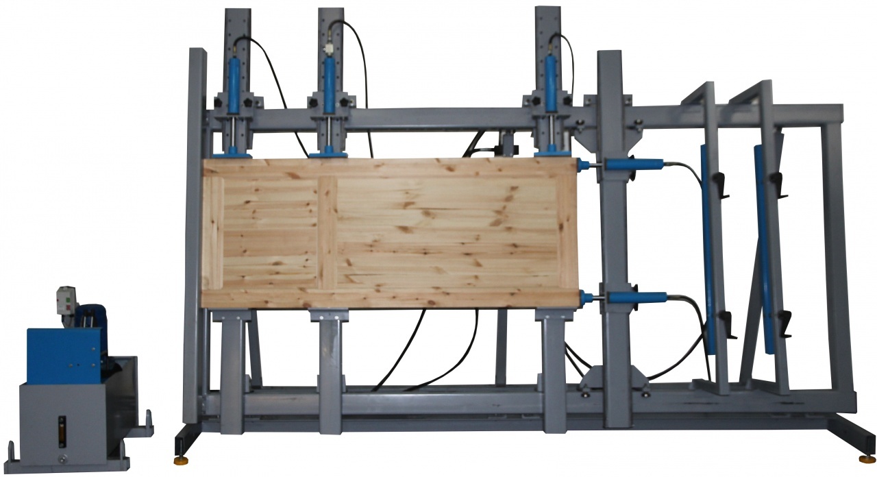 В стандартной комплектации оснащается тремя вертикальными, двумя горизонтальными прессующими блоками и две фронтальные балки с ручным прижимом. Горизонтальные передвижные прессующие блоки расположены на вертикальной передвижной балке.