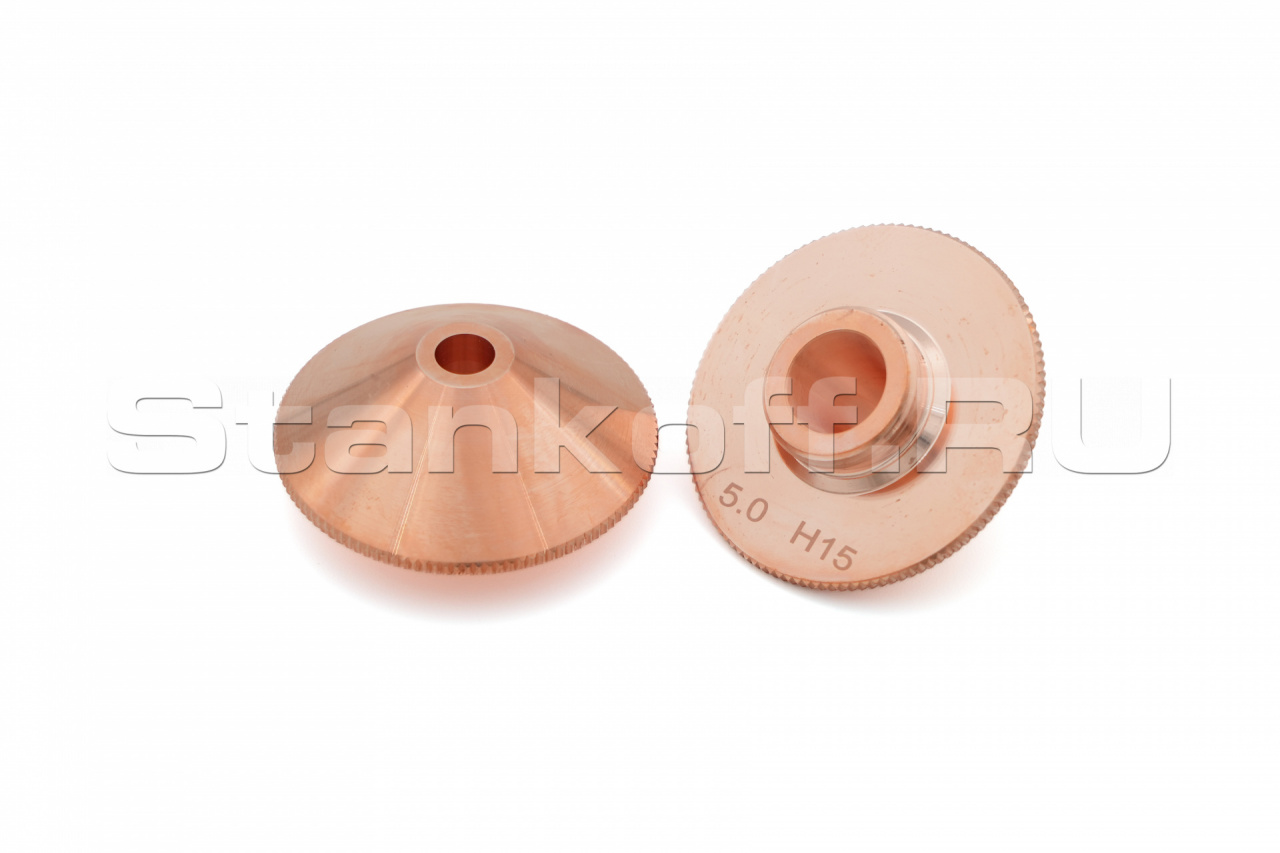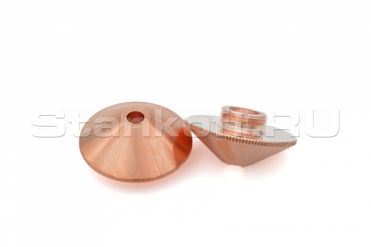 Используется в качестве электрода для корректной работы датчика слежения за поверхностью, а также для подачи лазерного излучения и режущего газа (опционально) в зону обработки. Срок службы зависит от условий эксплуатации. Все сопла Raytools характеризуются прочностью и надежностью. Сопловая часть лазерной головки состоит из керамического держателя и непосредственно сопла. Эта часть обеспечивает соосность лазерного излучения и струи газа. Во всех соплах используется функция центровки, которая позволяет быстро изменять и выравнивать положение сопла. Одинарные сопла используются для резки тонкого материала, нержавеющей стали и алюминия. Для полного охвата диапазона толщины сопла имеют диаметр в диапазоне от 1 мм.