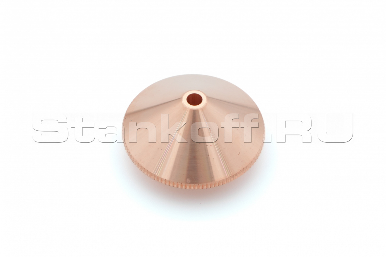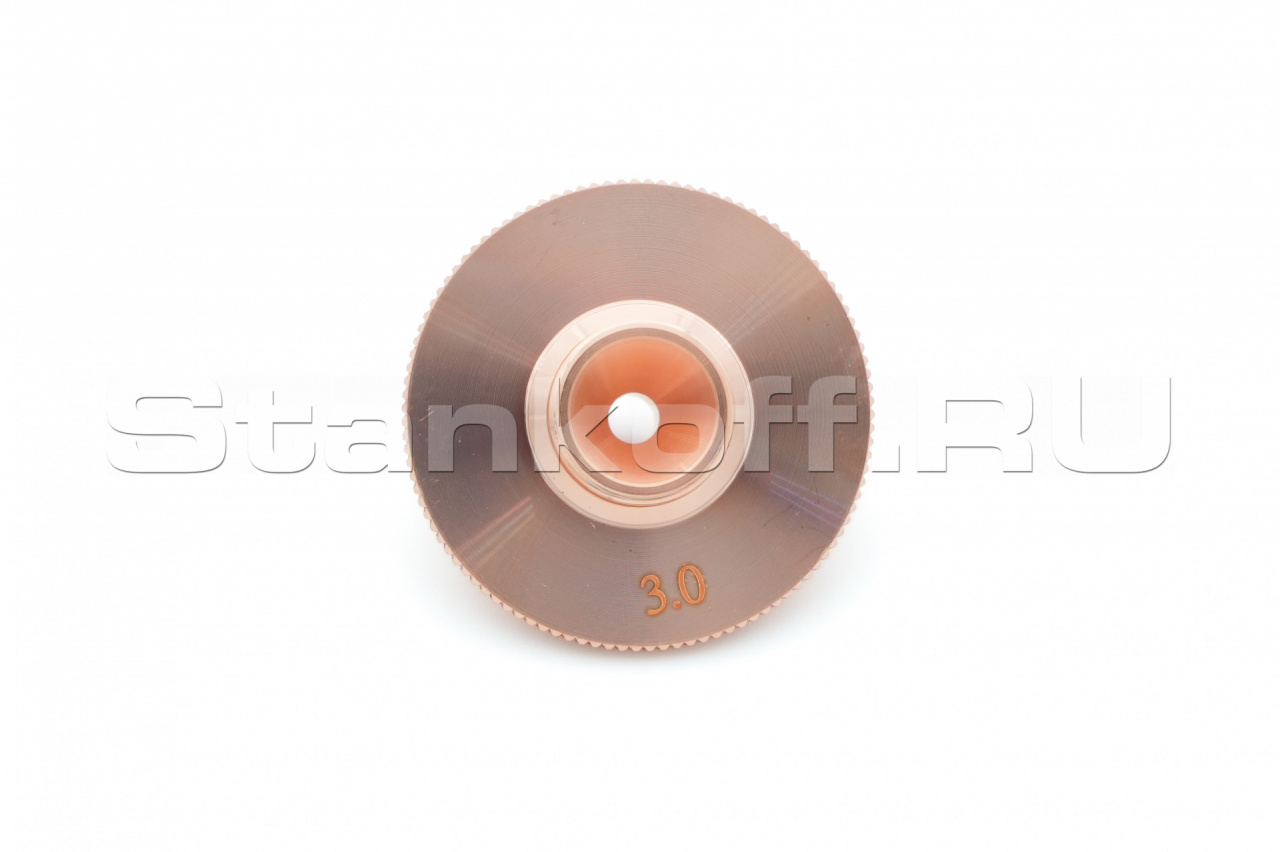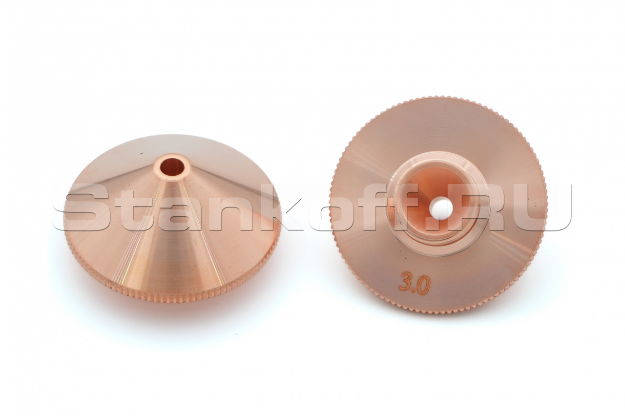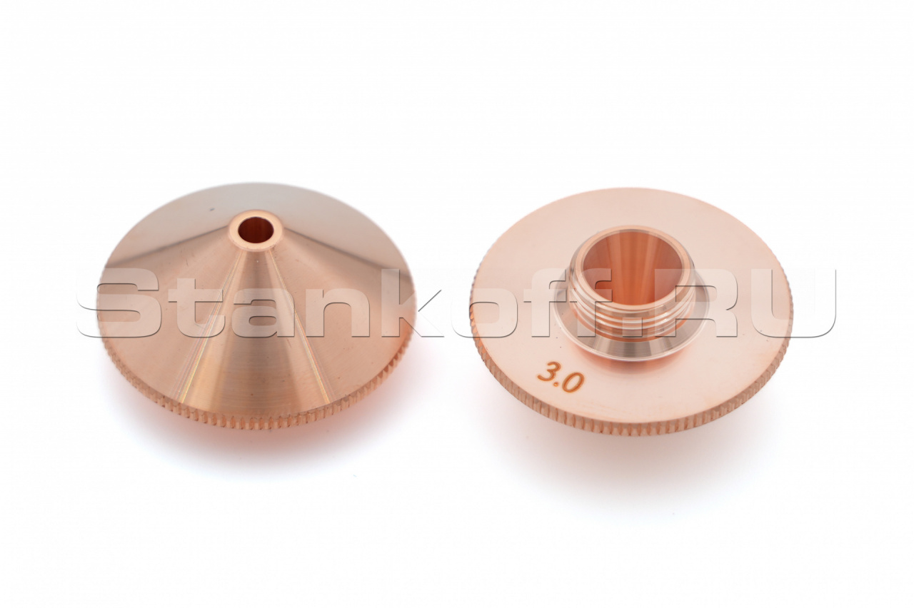 Используется в качестве электрода для корректной работы датчика слежения за поверхностью, а также для подачи лазерного излучения и режущего газа (опционально) в зону обработки. Срок службы зависит от условий эксплуатации. Все сопла Raytools характеризуются прочностью и надежностью. Сопловая часть лазерной головки состоит из керамического держателя и непосредственно сопла. Эта часть обеспечивает соосность лазерного излучения и струи газа. Во всех соплах используется функция центровки, которая позволяет быстро изменять и выравнивать положение сопла. Одинарные сопла используются для резки тонкого материала, нержавеющей стали и алюминия. Для полного охвата диапазона толщины сопла имеют диаметр в диапазоне от 0,8 мм до 10 мм.