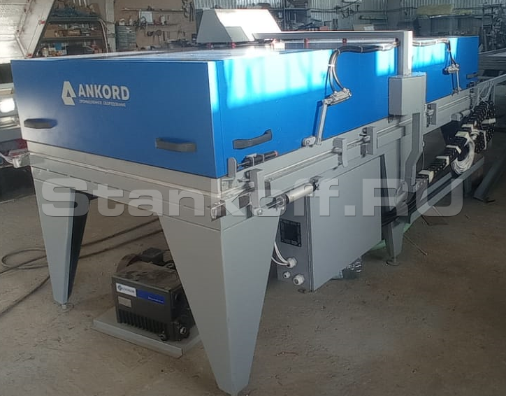 Подъем/опускание стола вертикально за счет пневмоцилиндров, позволяет обтягивать плёнкой ПВХ радиусные фасады высотой от 200 мм, а также формовать изделия из листового пластика. Вертикальных ход стола возможен до 1000 мм (чем больше ход стола, тем больше габаритная высота станка).Пресс с пневмоподъемом термомодуля, пневмоприжим прижимной рамки