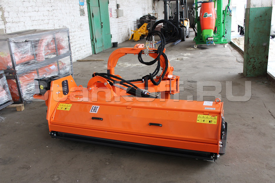 - Дополнительный манипулятор с системой гидравлического смещения – позволяет работать параллельным курсом с трактором под различными углами, обрабатывая склоны и бугры. Дает возможность мульчирователю смещаться относительно направления движения, а также максимально приблизиться в приствольную зону для ее обработки;
