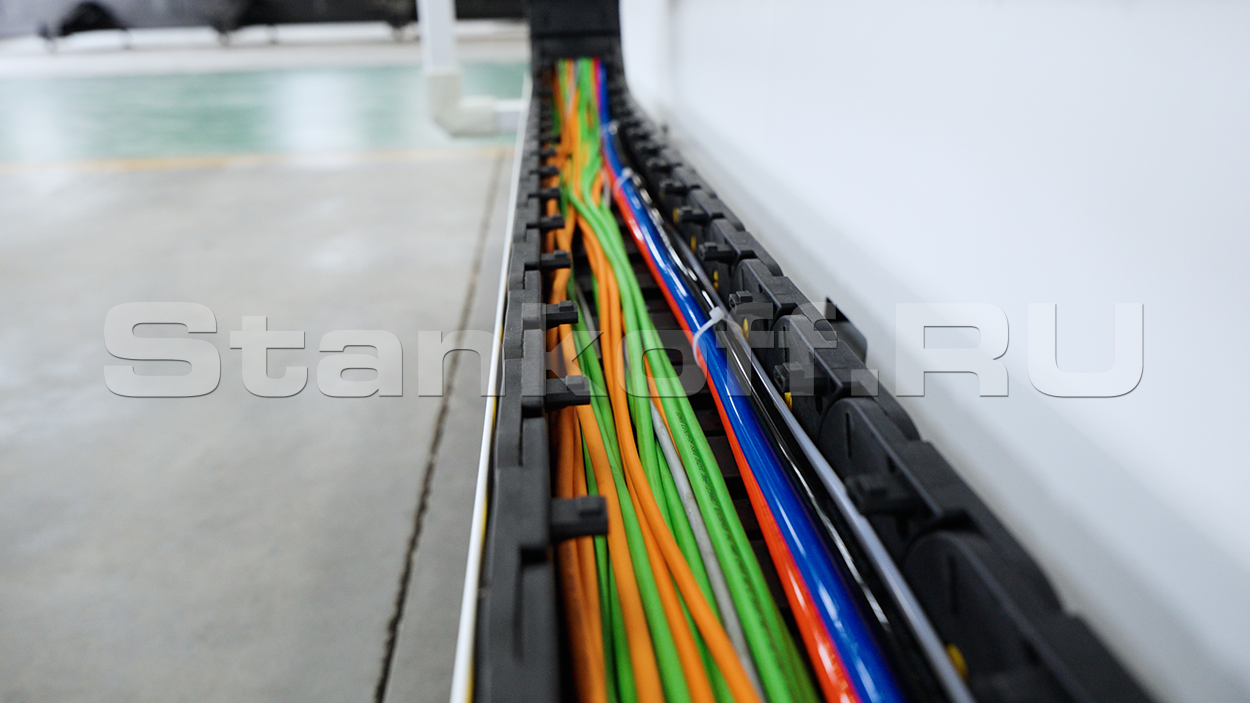 Направляющие и косозубые рейки станка закрыты гофрозащитными кожухами с металлическими накладками. Обычно используется только тканевая гофра, которая со временем прогорает и перестает выполнять грязезащитную функцию. Металлические накладки служат для предотвращения попадания окалины, искр, стружки на тканевую основу. Благодаря этому металлическому панцирю многократно увеличивается срок службы гофрированных кожухов.Все кабели уложены в гибкие кабельные цепи.