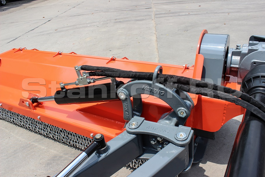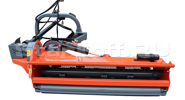 - Дополнительный манипулятор с системой гидравлического смещения – позволяет работать параллельным курсом с трактором под различными углами, обрабатывая склоны и бугры. Дает возможность мульчирователю смещаться относительно направления движения, а также максимально приблизиться в приствольную зону для ее обработки;