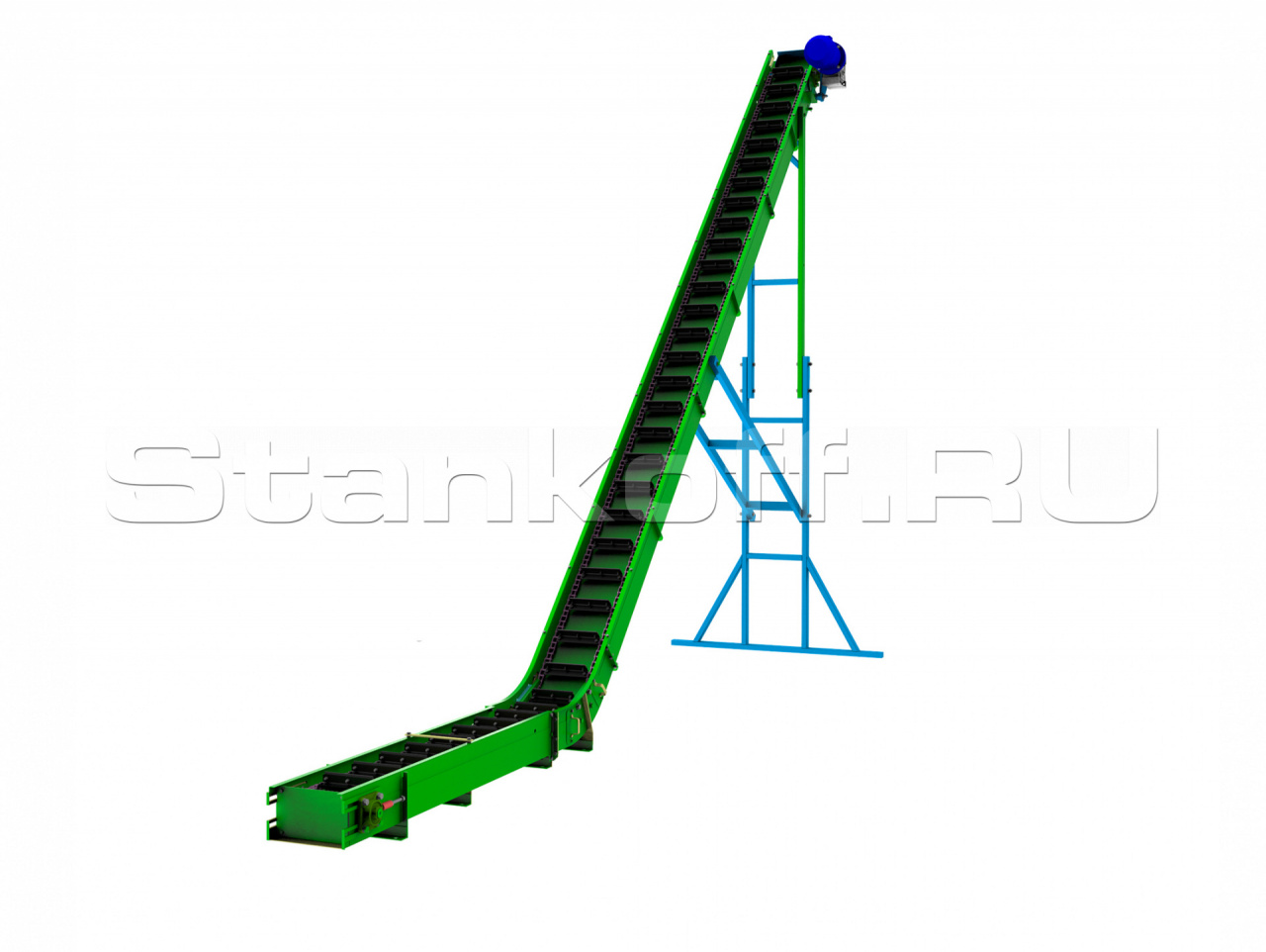 Представляет собой металлический короб прямоугольного сечения, изготовленные из листовой стали. Транспортер также оснащается стальной тяговой цепью, устойчивой к механическим воздействиям, лопатками (скребками) для перемещения продукции. Шаг между скребками составляет 228 мм. Также транспортер оснащается приводными звездочками и мощным мотор-редуктором, который обеспечивает высокую производительность. Все элементы наклонного цепного скребкового L-образного транспортера обеспечивают максимальную надежность и ремонтопригодность оборудования.