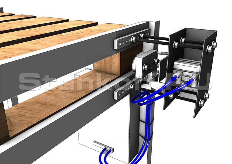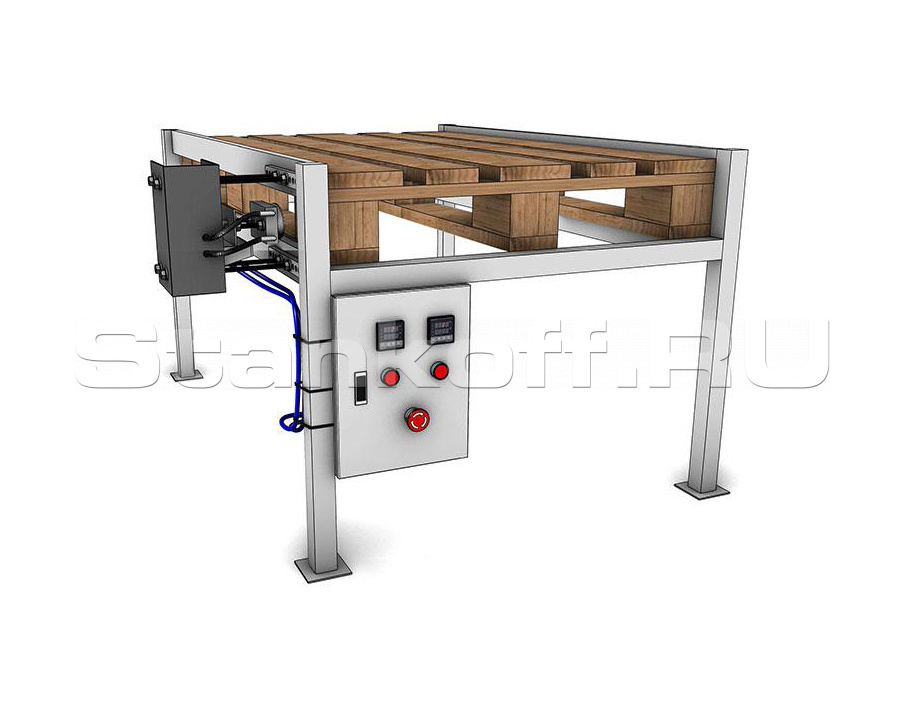 Станок предназначен для маркировки одновременно от 1 до 6-ти шашек на готовых поддонах. Станок представляет собой металлическую раму с возможностью установки электропневматических выжигательных блоков напротив каждой шашки поддона. Клейма на каждой нагревательной пластине сменные. Модуль представляет собой пневмопоршень с закрепленной на нем нагревательной пластиной. Позволяет крепить клейма размером до 110 х 70 мм. Мощность одного нагревателя: 500 Вт. Может быть оснащен автоматической системой контроля температуры, времени и усилия прижатия.