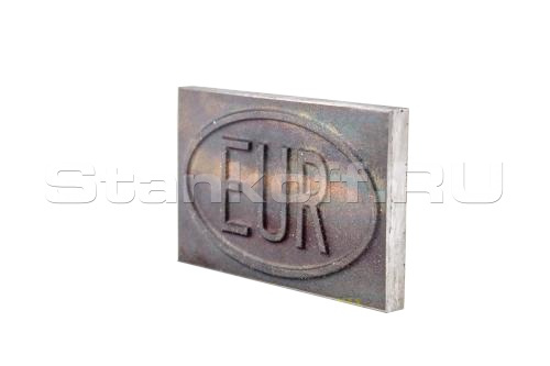 Знак «EUR» выжигается на шашках поддона и говорит о том, что данный поддон соответствует размерам и грузоподъемности принятым в европейских стандартах. Клише для маркировки поддона знаком «EUR» мы можем изготовить из стали или латуни. Преимуществом латунного клейма можно назвать коррозионную стойкость, лучшую теплопроводность и выгодную цену. Стальные клейма отличаются механической прочностью, их трудно перегреть и их срок службы обычно дольше.