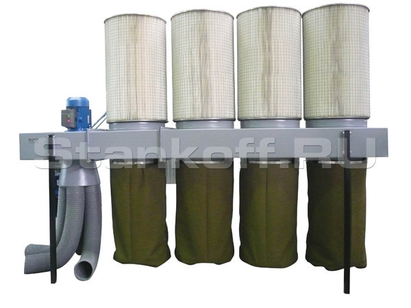 Стружкоотсос УВП-7000-ФК для одновременного обслуживания одного, двух или более станков. Производительность 7000 м³/час, площадь фильтрования 108 м2, четыре мягких накопителя общим объемом 0,8 м³, электродвигатель 5,5 кВт, на стойках, фильтрующий элемент - картридж без механизма регенерации.