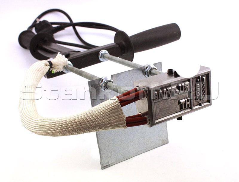 Устройство предназначено для маркировки большого объема поддонов и паллет методом выжигания. Прибор состоит из нагревателя модели ТТ и стального клейма с 4 ТЭНами. Преимуществом данного выжигателя является непосредственный нагрев рабочей зоны клейма, что повышает производительность. В отличие от выжигателя со сменным клеймом, конструкция данного устройства значительно надежнее, но не позволят быстро менять клеймо.