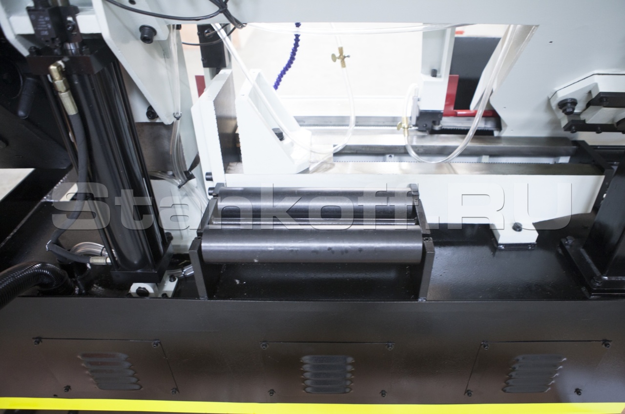 Станок оснащен гидравлическими тисками с возможностью быстрого зажима заготовок. Помимо механической подачи тисков, гидравлический ход тисков для быстрого зажима составляет 60 мм. Для облегчения подачи заготовок станок оборудован роликовым столом с двумя роликами.
