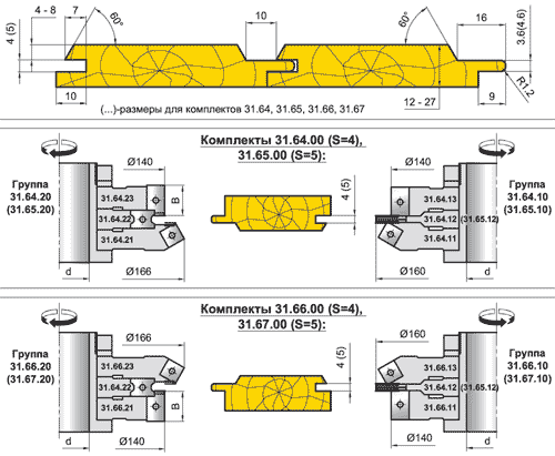 Комплект фрез для профилирования фасочной вагонки (паз S=4-5мм)(31.64.00, 31.65.00, 31.66.00, 31.67.00)