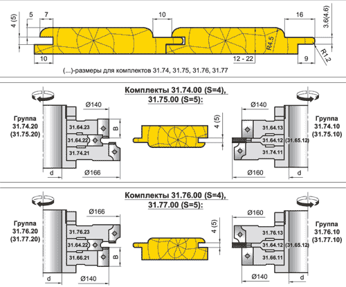 Комплект фрез для профилирования радиусной вагонки (паз S=4-5мм)(31.74.00, 31.75.00, 31.76.00, 31.77.00)
