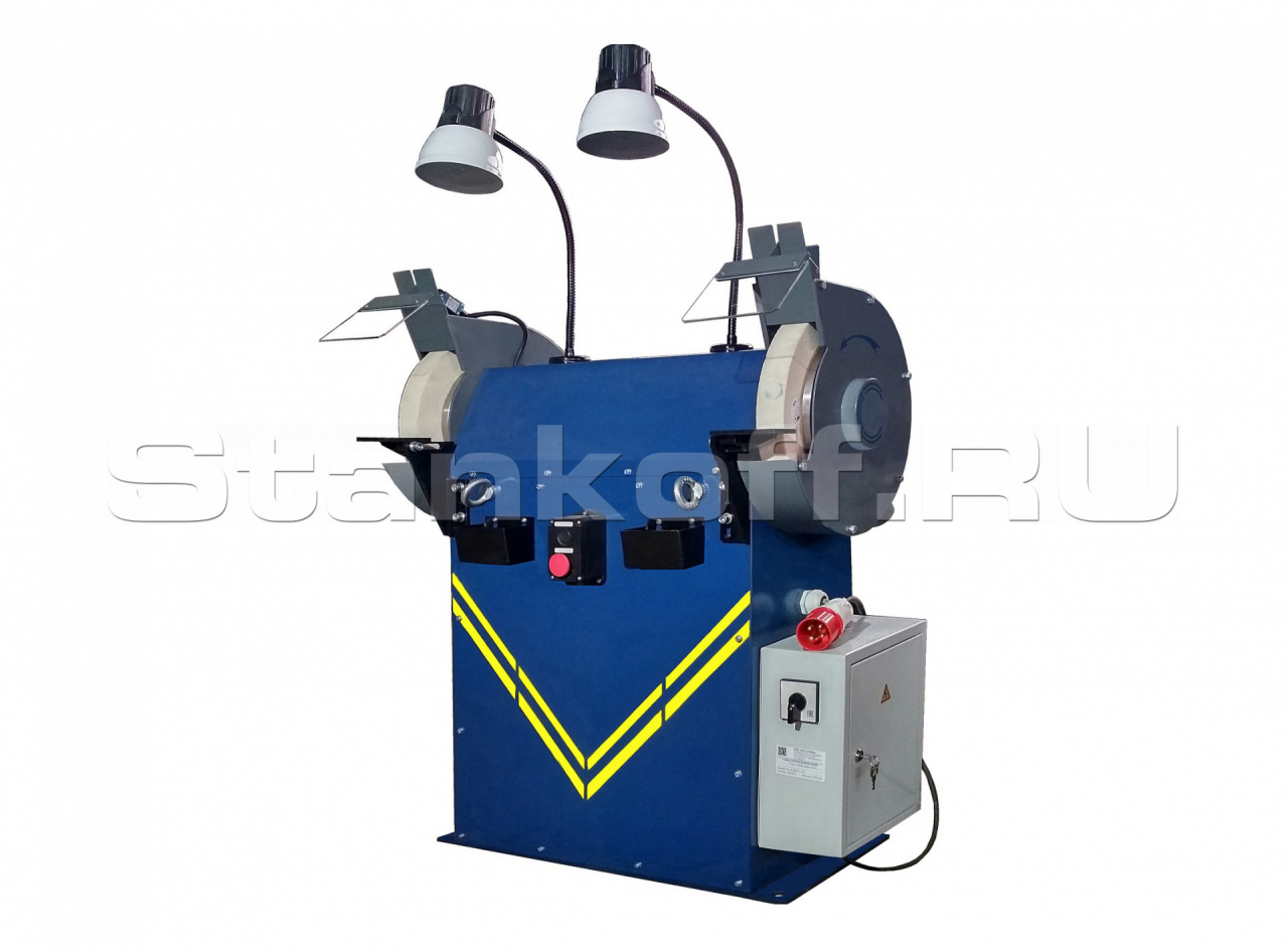 На станок установлен концевой выключатель для блокировки двигателя при поднятии защитного экрана. Регулировка упоров по горизонтали и вертикали обеспечивает удобную работу на станке. Установлены съемные металлические ёмкости для охлаждающей жидкости. Защитные кожуха имеют выходные вентиляционные патрубки для подключения пылеотсосов, позволяющих фильтровать воздух от абразивной пыли в рабочей зоне оператора.