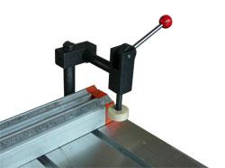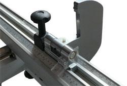 Боковая базовая линейка на подвижном столе каретки имеет возможность поворота на угол до 45 градусов. Обеспечивается обработка заготовок под углом, что значительно расширяет технологические возможности станка. - В стандартную комплектацию станка входит эксцентриковый прижим для надежной фиксации детали.