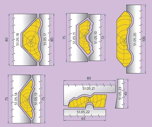 На четырехсторонних или фрезерных станках головки этого класса могут работать как фуговальные, комплектуясь при этом прямыми фуговальными ножами типа 51.03.40.
