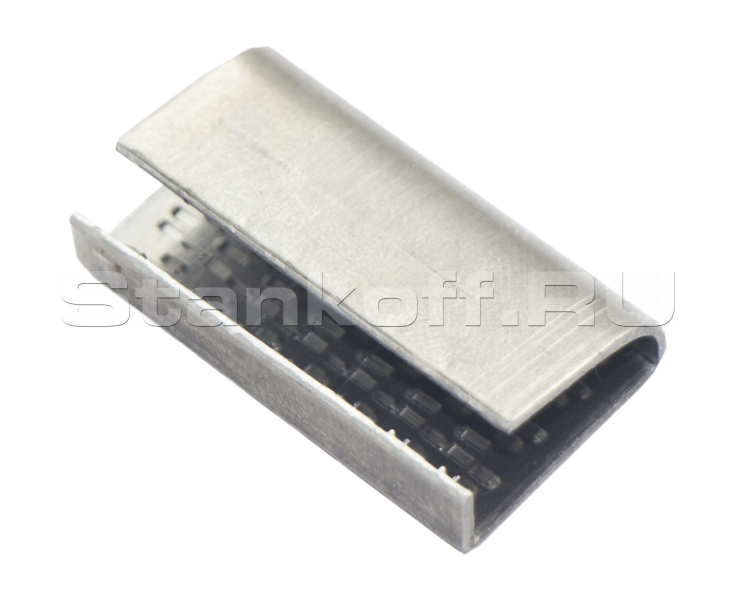 Скоба для обвязки полиэстеровой лентой изготавливается в полузакрытой форме, для удобства использования. Таким образом, при упаковке, она не сваливается с ленты и ее проще скрепить.