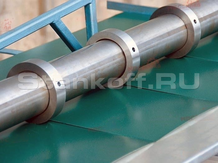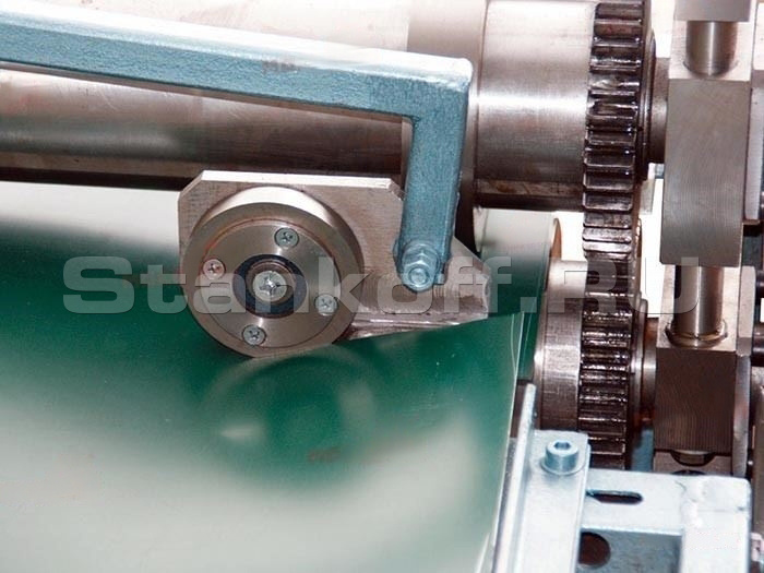 Валы с установленными на них дисковыми ножами приводятся в действие за счет мотор-редуктора, соединенного через цепную передачу с нижним валом, перебрасывая момент с помощью шестеренок с нижнего вала на верхний. Быстрая и легкая регулировка ножей на различную ширину заготовки осуществляется посредством крепления ножей стопорными винтами в 2 симметрично отфрезерованные плоскости на валу. Высокое качество реза обеспечено точностью обработки сопрягающихся поверхностей ножа и вала (шлифованные поверхности), а также их точной посадкой, что исключает перекос и биение ножей при установке и эксплуатации. Расстояние между ножами станка продольно-поперечной резки выставляется по шаблону или штангенциркулем.