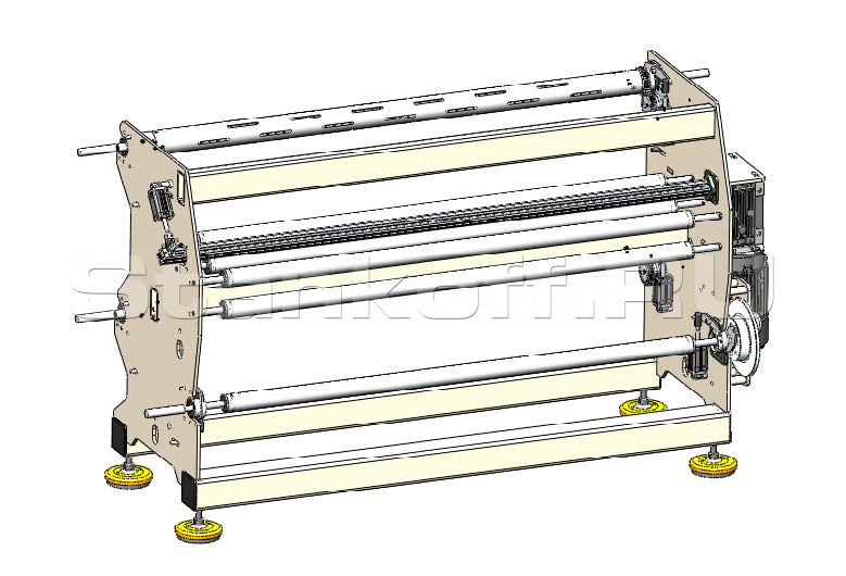 Состоит из 1 вала основной оси размотки и 2 пневмовалов осей намотки разрезаемого материала c шестеренчатым приводом антистатической планкой, электронным счетчиком и пистолетом для надува пневмовалов.
