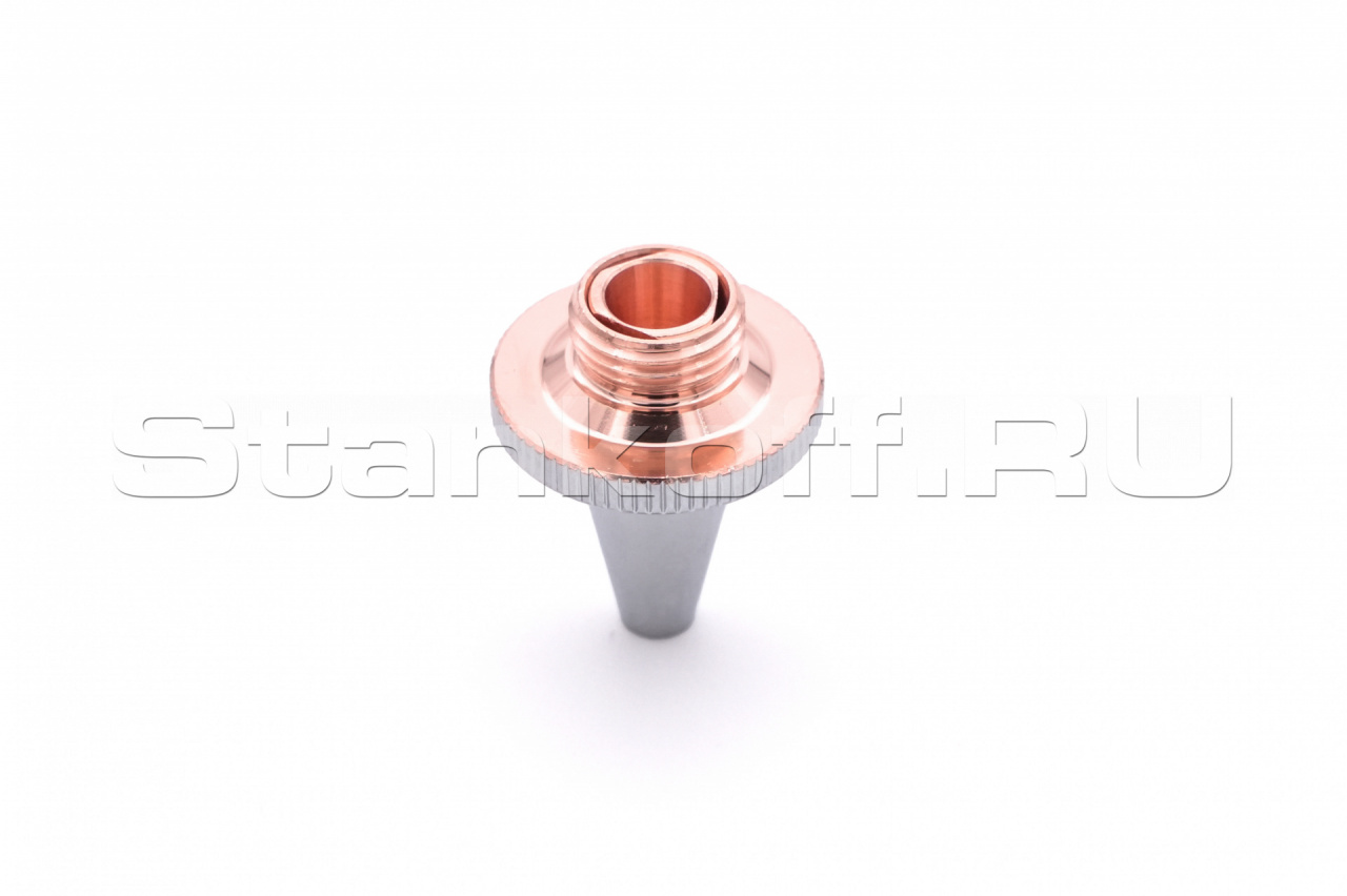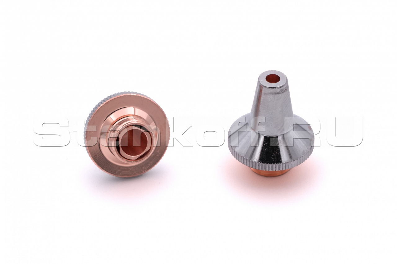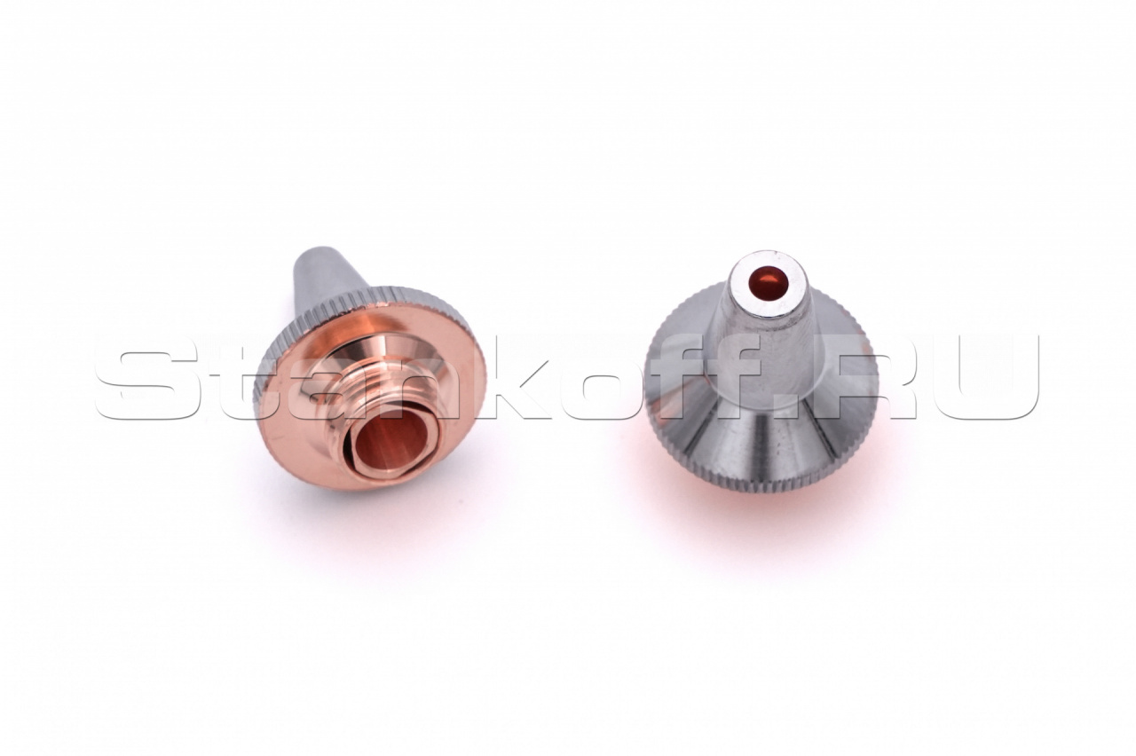 Используется в качестве электрода для корректной работы датчика слежения за поверхностью, а также для подачи лазерного излучения и режущего газа (опционально) в зону обработки. Срок службы зависит от условий эксплуатации. Все сопла Raytools характеризуются прочностью и надежностью. Сопловая часть лазерной головки состоит из керамического держателя и непосредственно сопла. Эта часть обеспечивает соосность лазерного излучения и струи газа. Электролитическое хромирование максимизирует срок эксплуатации, сокращает адгезию при разбрызгивании и обеспечивает стабильное определение высоты. Во всех соплах используется функция центровки, которая позволяет быстро изменять и выравнивать положение сопла. Двойные сопла улучшают качество поверхности при кислородной резке низкоуглеродистой стали. Для полного охвата диапазона толщины сопла имеют диаметр в диапазоне от 0,8 мм до 10 мм.