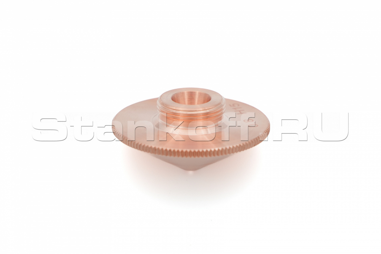 Используется в качестве электрода для корректной работы датчика слежения за поверхностью, а также для подачи лазерного излучения и режущего газа (опционально) в зону обработки. Срок службы зависит от условий эксплуатации. Все сопла Raytools характеризуются прочностью и надежностью. Сопловая часть лазерной головки состоит из керамического держателя и непосредственно сопла. Эта часть обеспечивает соосность лазерного излучения и струи газа. Во всех соплах используется функция центровки, которая позволяет быстро изменять и выравнивать положение сопла. Одинарные сопла используются для резки тонкого материала, нержавеющей стали и алюминия.