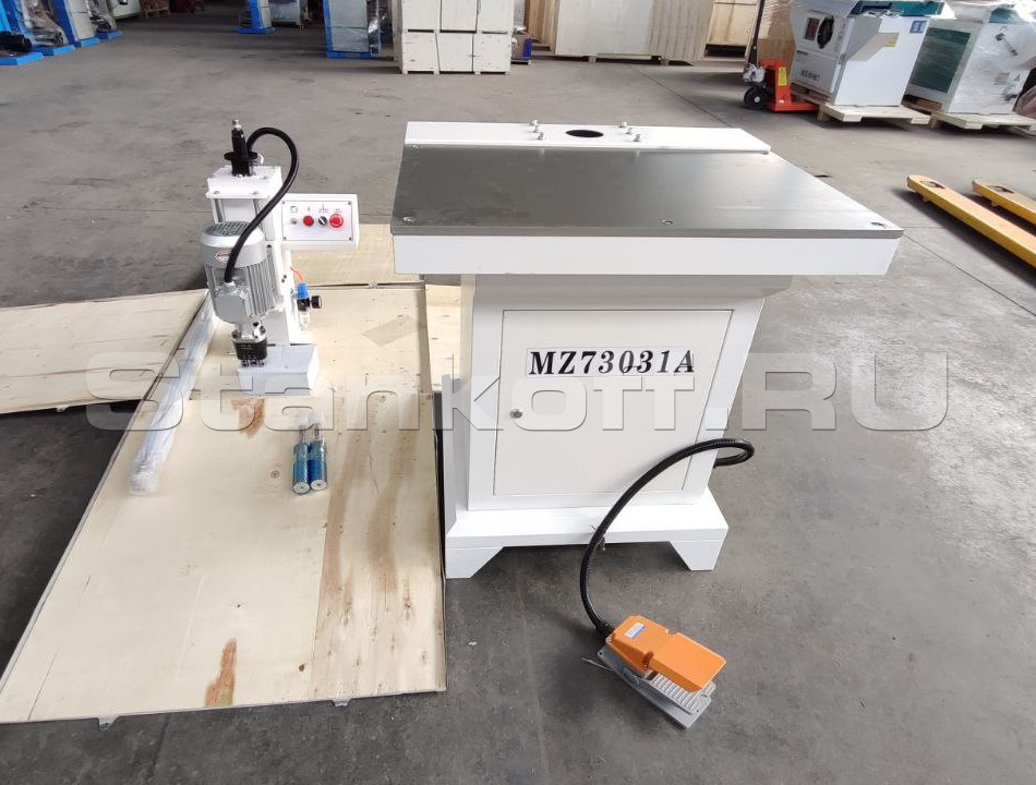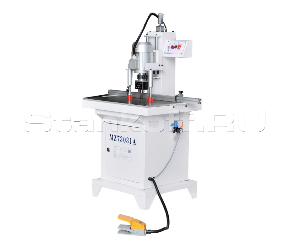Станок JZ-2800 предназначен для фрезерования отверстий в мебельных фасадах под петлю с креплением. Он оснащен двумя пневматическими цилиндрами для надежного прижима детали, а автоматическое управление операциями обеспечивается старт-педалью. Станок имеет боковые линейки и линейку с двумя откидными упорами для точного позиционирования материала.
