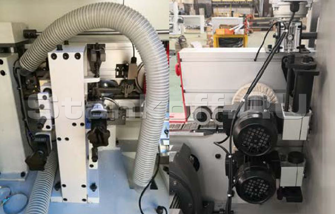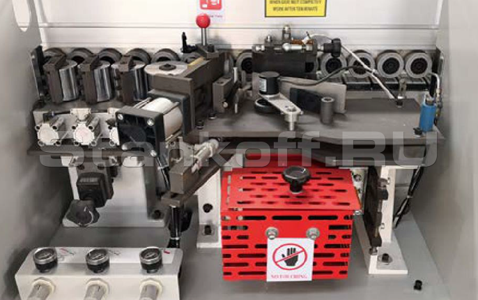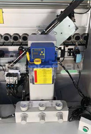 Узел имеет тонкую регулировку, которая позволяет выставить нанесение клея для любого типа кромочного материала. Система нагрева обеспечивается пальчиковыми тэнами, расположенными по всему периметру клеевого узла, в том числе в верхней его части, чтопрепятствует застыванию клея и обеспечивает стекание излишков обратно в клеевую ванну. Данная конструкция узла значительно снижает количество брака на производстве.