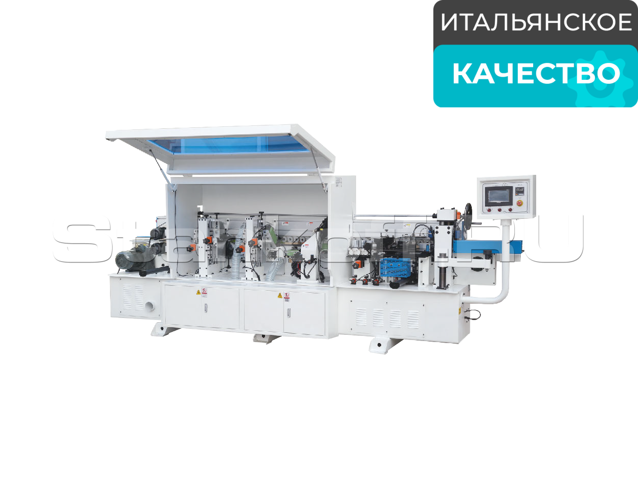 Обначена современными элементами управления и сенсорным дисплеем для настройки и контроля процессе кромкооблицовки. Основной интерфейс управления позволяет оператору легко настраивать параметры станка, такие как скорость подачи, температуру клеевого узла и другие важные настройки для качественной обработки панели.