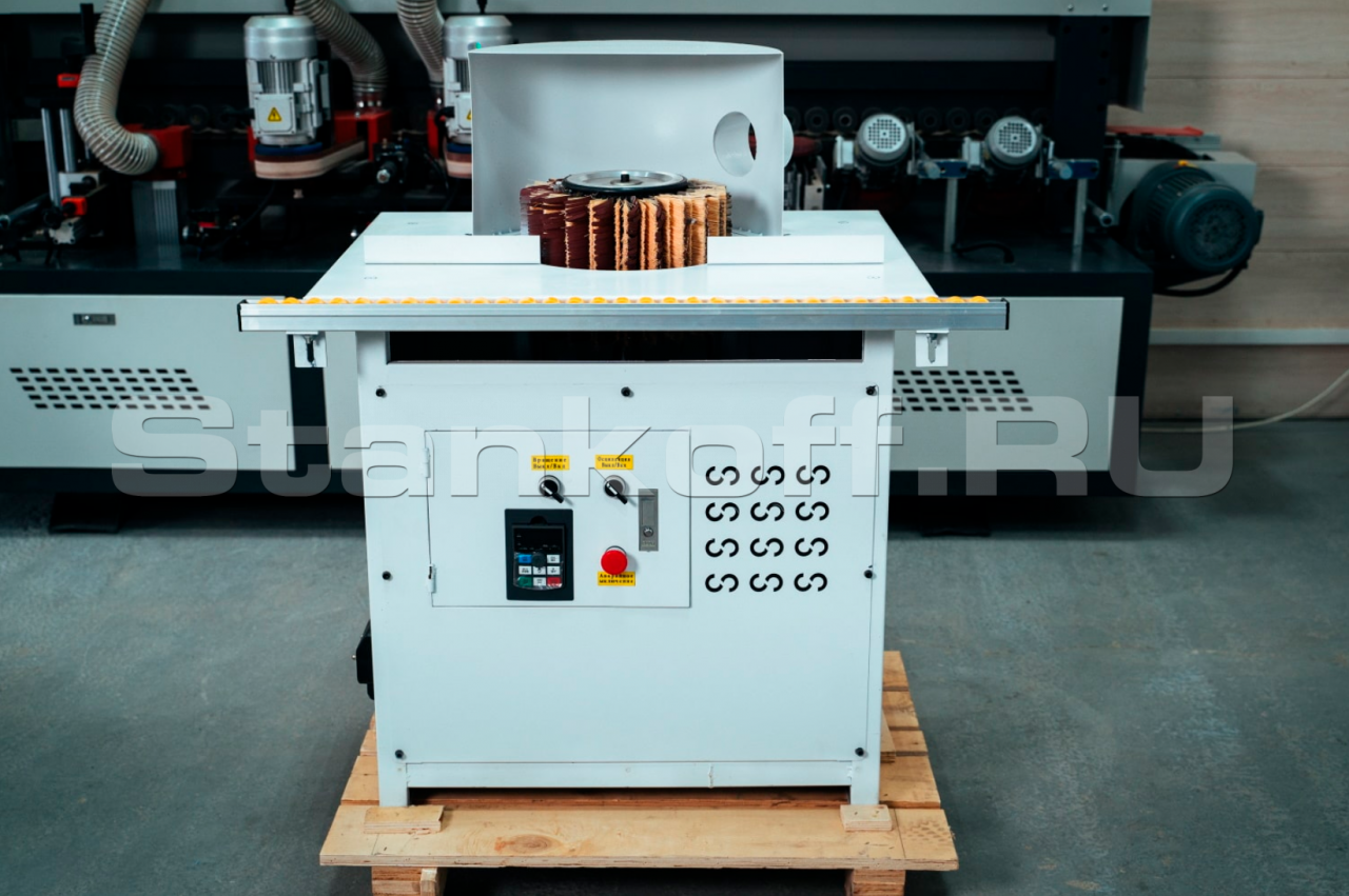 Станок оснащен одним вертикальным барабаном, который перемещается вверхвниз, так называемый механизм осцилляции. Простая и удобная смена абразивных вкладышей и поддерживающих сизалевых щеток.