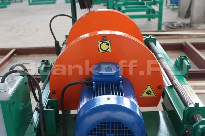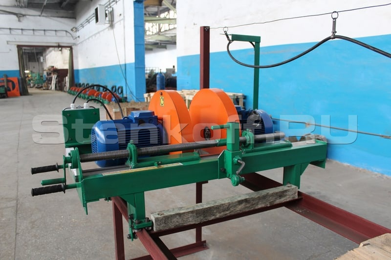 Конструктивно кромкообрезной станок выполнен в виде каретки с пильным узлом, перемещающейся по неподвижному столу с лежащей на нем заготовкой. Пильный узел оснащен двумя электродвигателями по 5,5 кВт. И дисковые пилы диаметром 450 мм обеспечивающие толщину пропила до 65 мм Расстояние между пилами регулируется вручную при помощи винтовой передачи. Дисковые пилы сводятся-разводятся от центра станка, так же имеется возможность фиксации одной пилы в постоянном положении. Подача каретки вдоль заготовки осуществляется вручную.