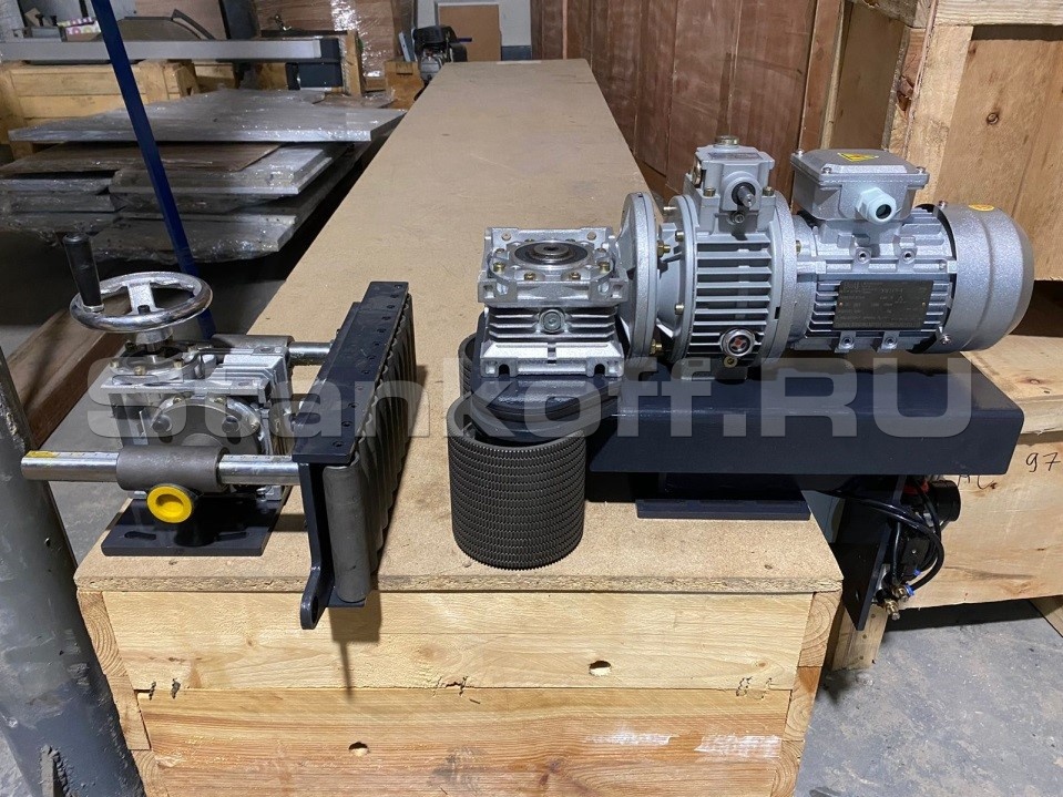Подающее устройство предназначено для автоматической равномерной подачи заготовок и их деления ленточной пилой на детали заданной ширины.
