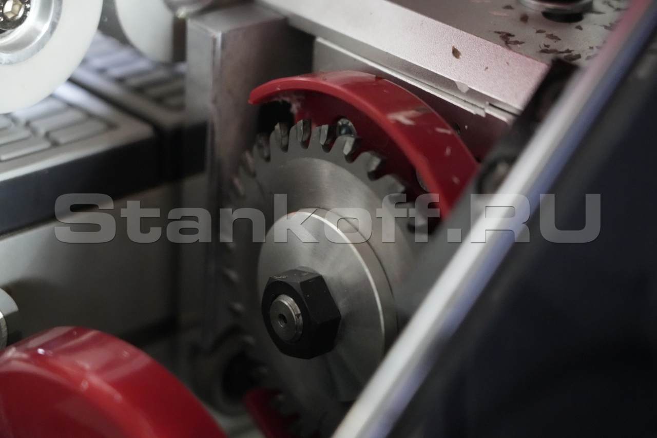 Узел предварительного фрезерования панели способен удалять кромку панели, позволяя устранять дефекты, возникающие в результате пиления, и корректировать ошибки, вызванные неправильной настройкой пильного диска. Узел защищён красным защитным кожухом, что обеспечивает безопасность работы и повышает эффективность сбора пыли.