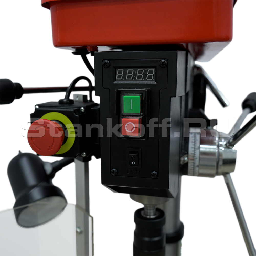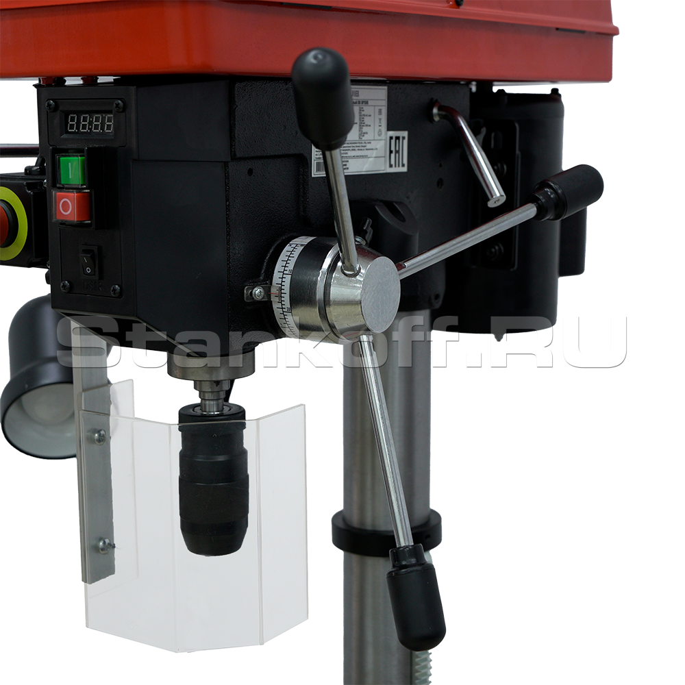 Одной из его отличительных черт является увеличенный ход пиноли шпинделя до 102 мм, что гарантирует точное регулирование глубины сверления. Расстояние от оси патрона до колонны составляет 200 мм, что позволяет работать с крупными заготовками. Максимальные расстояния от шпинделя до стола и основания — 750 мм и 1240 мм соответственно — позволяют обрабатывать высокие детали.