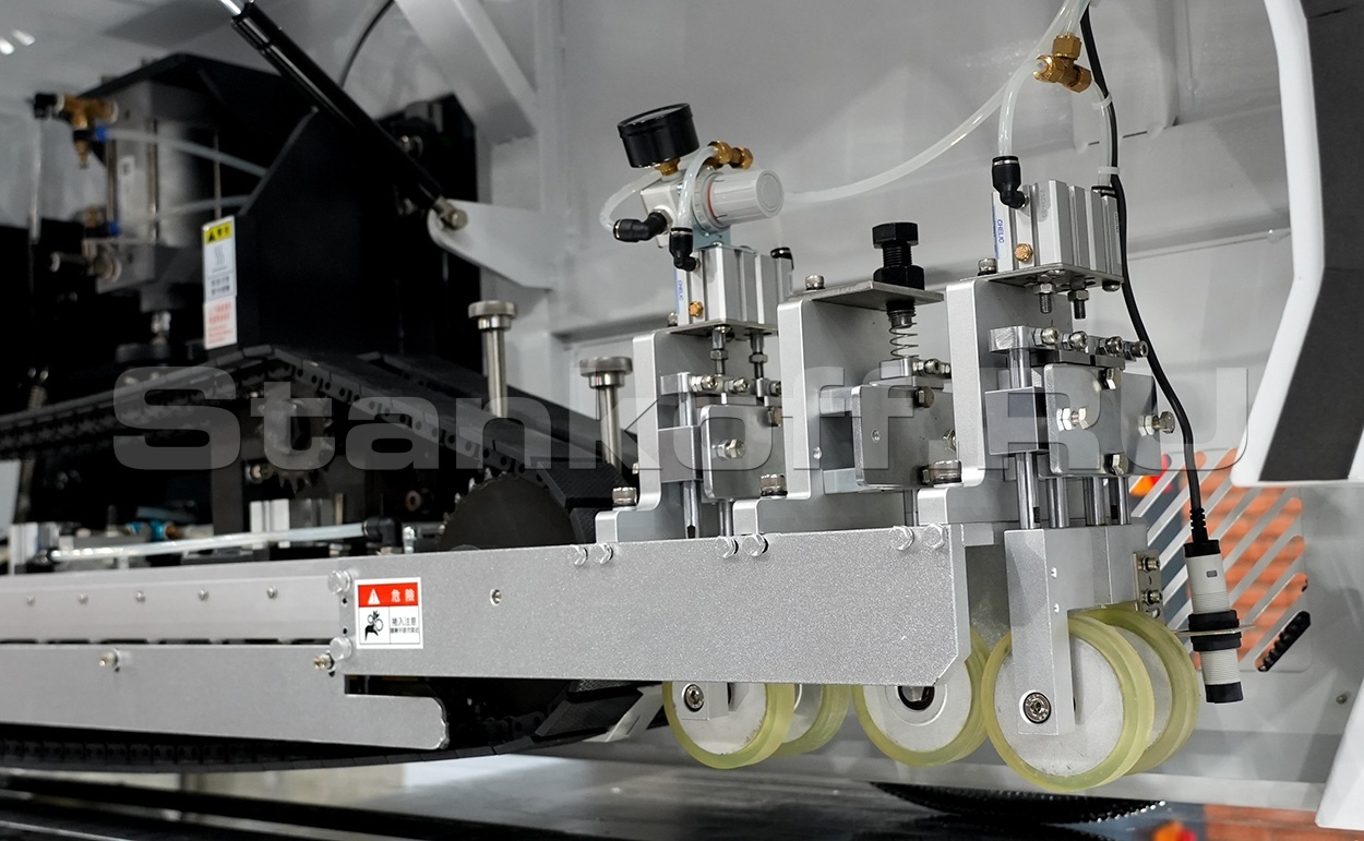 - Подающий прижимной ролик с контролем гарантирует синхронную подачу листов, предотвращая смещение материала;