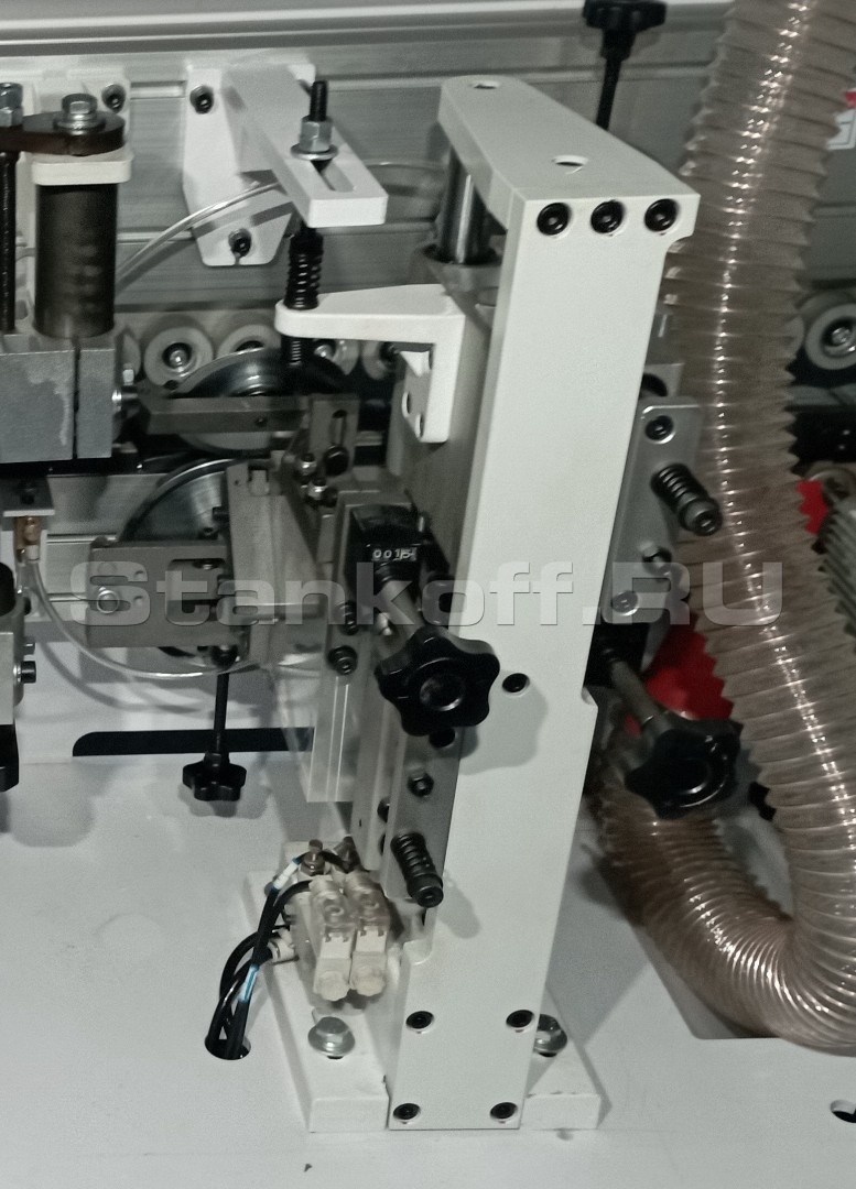 - Фрезерный блок для снятия свесов по длине двумя твердосплавными высокочастотными горизонтальными фрезами с приводом от 2-х высокочастотных моторов работает по дисковым копирам;