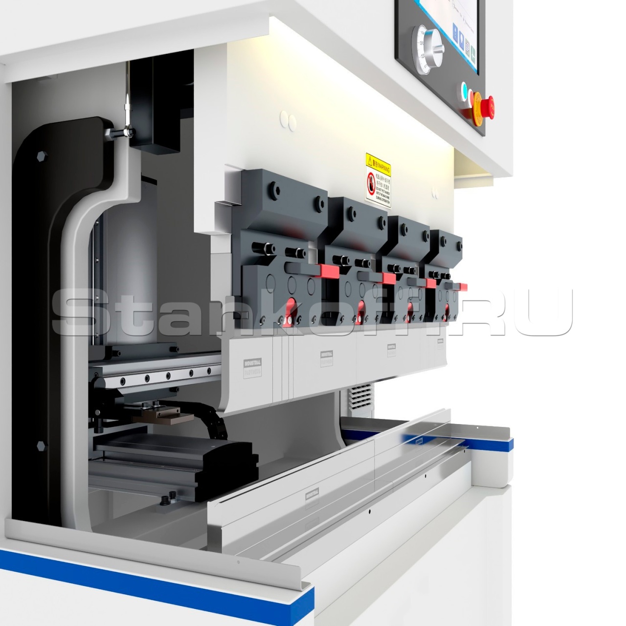 Кроме того, для работы на этом оборудовании не требуется длительное обучение оператора — станок интуитивно понятен и готов к использованию практически сразу после установки. В комплекте со станком поставляется гибочный инструмент на всю длину оборудования. Весь поставляемый гибочный инструмент изготовлен из высоколегированной стали 42CrMo4 с глубокой индукционной закалкой рабочих частей на глубиной 4-5 мм до твердости 55-58 HRC и пескоструйной обработкой.