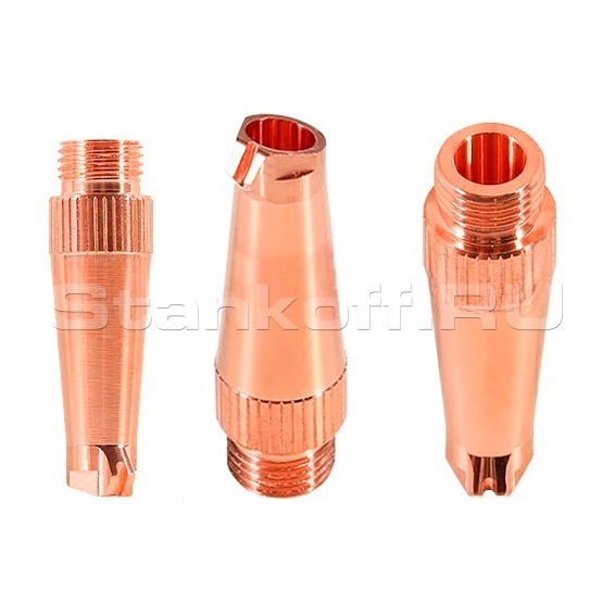 Сопло высотой 40 мм и диаметром 11,8 мм имеет специальную канавку для прохождения сварочной проволоки. Оно изготовлено из меди — материала, обладающего высокой теплопроводностью и устойчивостью к экстремальным температурам. Благодаря этим свойствам медь является идеальным выбором для сварочных сопел, обеспечивая их долговечность и эффективность. Сопло также направляет защитный газ в зону сварки, предотвращая окисление и нежелательные химические реакции.