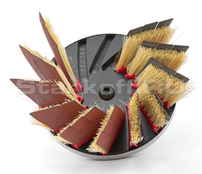 T90Н представляет собой торцевую насадку с пазами для щеточно-шлифовальных сегментов. Широко используется мастерами в шлифовании филенчатых фасадов из МДФ (для бережной обработки внутреннего угла), различных накладок, панелей при декоративном оформлении стены, 3D поверхностей массива с разным перепадом высот, плоскостей и не только. После сборки необходимо установить стопорное металлическое кольцо и стопорное резиновое кольцо. Втулка изготавливается из ударопрочного пластика, который служит очень долго.