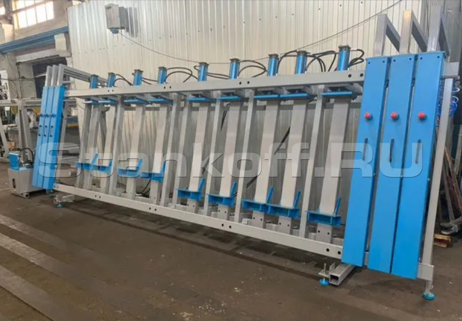 Оснащена 2-х или 3-ёх поточным насосным агрегатом, что обеспечивает регулировку усилия гидроцилиндров в диапазоне от 1 до 10 тонн и позволяет разделять пресс на несколько зон склеивания.Принцип работы