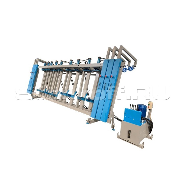 Гидравлические блоки снабжены системой устойчивости к высокому давлению и защитой от протекания. Пневматические откатные фронтальные прижимы удобно и быстро устанавливаются и автоматически с помощью кнопки зажимают пакет на необходимое усилие. Вертикальные гидравлические прижимы SLU перемещаются по длине пресса. Гидростанция оснащена 2-х или 3-ёх поточным насосным агрегатом, что обеспечивает регулировку усилия гидроцилиндров в диапазоне от 1 до 10 тонн и позволяет разделять пресс на несколько зон склеивания.