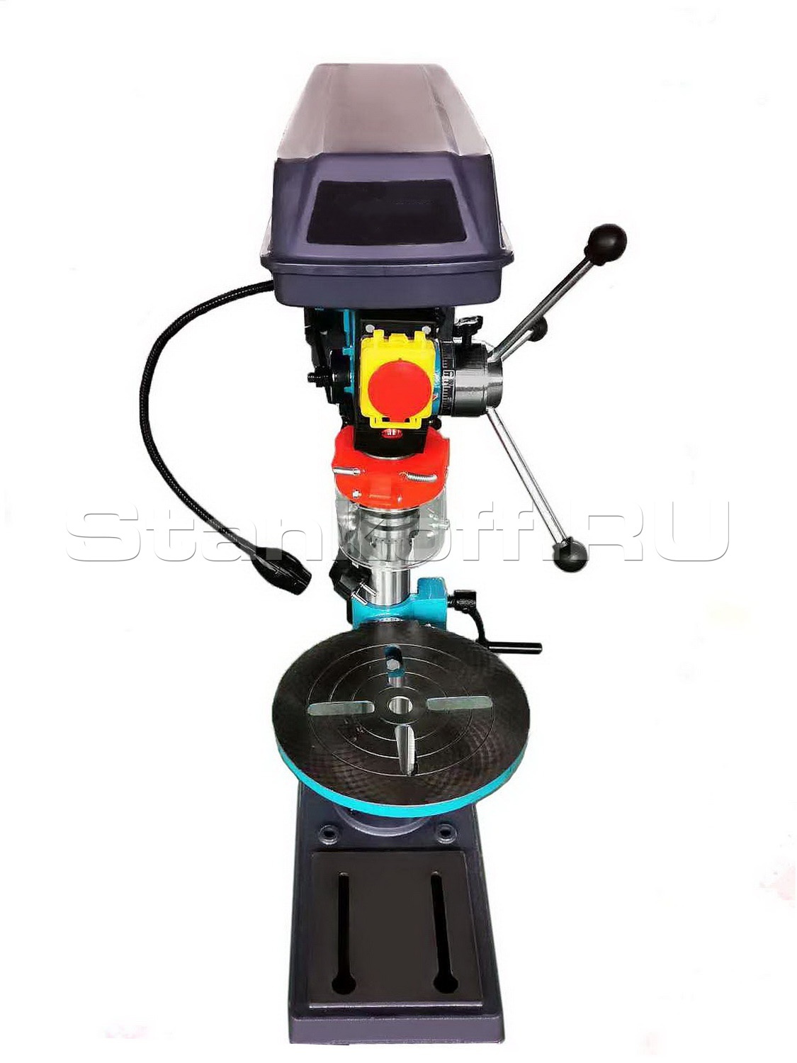 Станок оснащён поворотным и наклонным столом, LED-подсветкой, лазерным указателем, аварийной кнопкой остановки и прозрачным защитным экраном. В комплект входят машинные тиски. Идеально подходит для слесарных и столярных работ, особенно в условиях мелко- и среднесерийного производства.