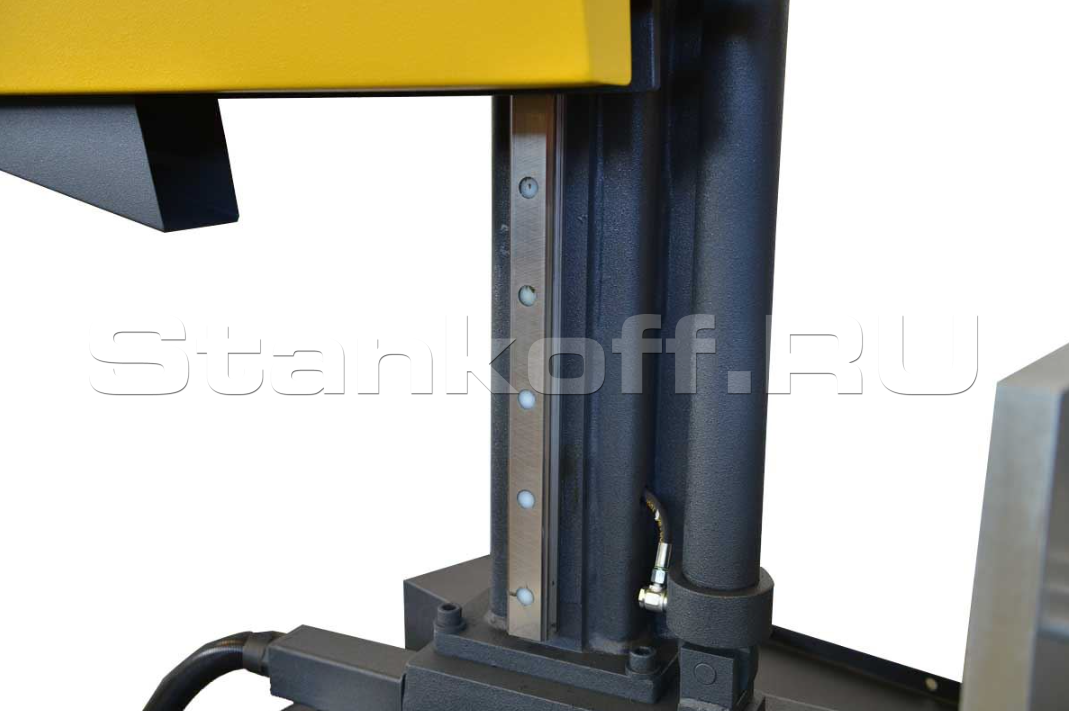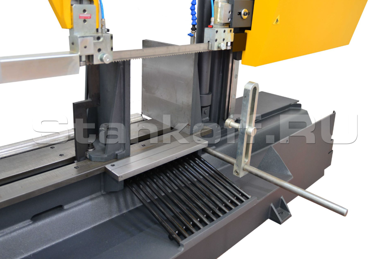 Двухколонный полуавтоматический ленточнопильный станок BMSY 330C оснащён гидравлическими тисками и предназначен для резки сталей (включая инструментальные, нержавеющие и титан), как профильных, так и сплошных. Подходит для пакетной и угловой (до 45°) резки благодаря поворотным губкам тисков. Перемещение пильной рамы осуществляется двумя гидроцилиндрами по направляющим с управления с пульта. Максимальное сечение заготовки — 360×330 мм. Жёсткая конструкция с двумя колоннами и вертикальными направляющими с подшипниками и твёрдосплавными вставками обеспечивает точную резку, снижает вибрации и увеличивает ресурс пилы и станка.