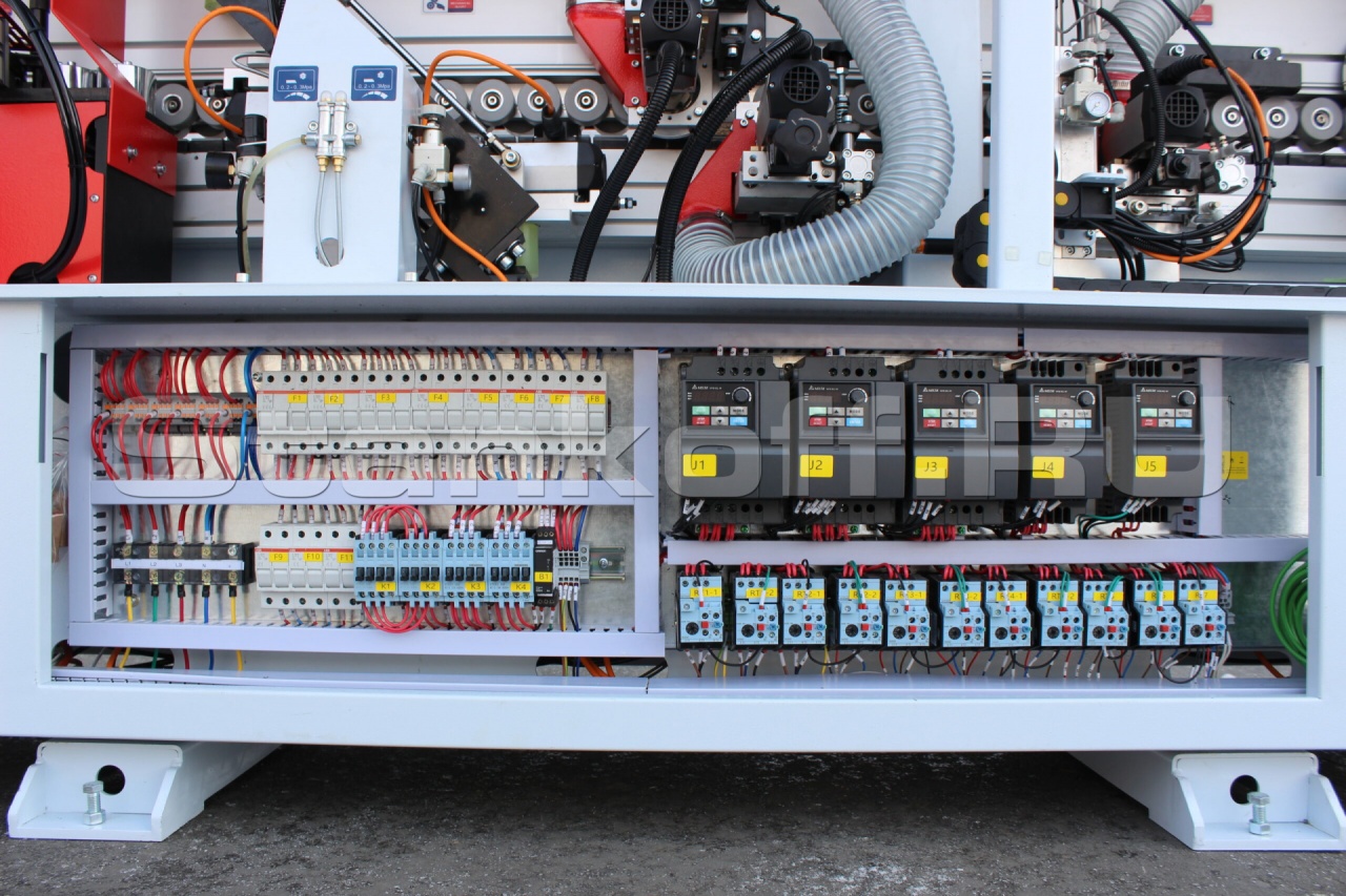 Управление станком происходит с сенсорной панели управления, которая обеспечивает доступ к функциям и настройкам станка. Данная панель позволяет оператору контролировать процессы станка, такие как настройка температуры для клеевого узла, регулировка скорости подачи материала, управление работой различных рабочих узлов и отслеживать состояние станка.