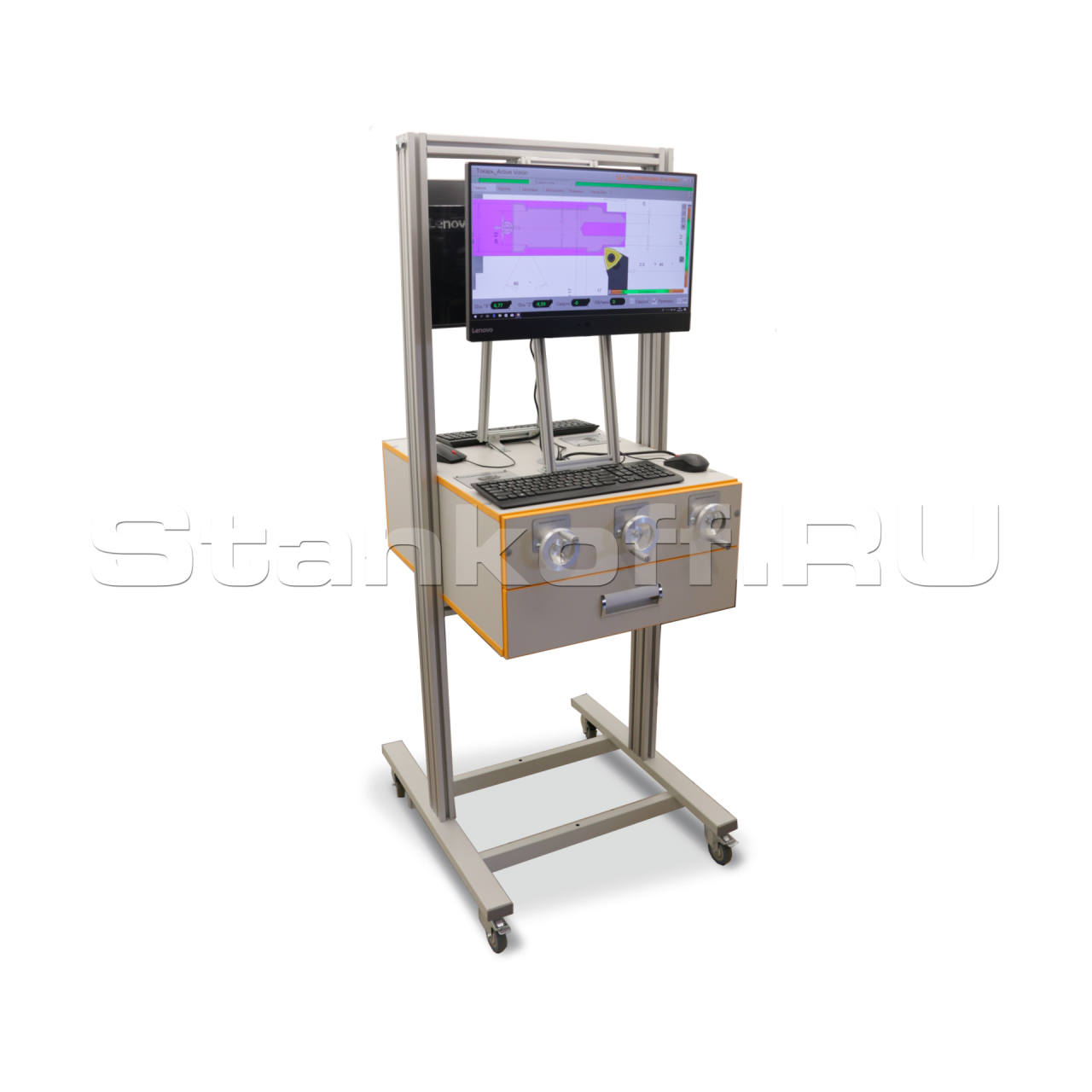 Токарно-фрезерный тренажер Active Vision — это интерактивная стойка для изучения основ металлообработки и работы токарных и фрезерных станков. Обучение проходит через имитацию органов станка и инструмента с помощью маховиков-имитаторов. Система включает стойку-тренажер с датчиками движения режущего инструмента и компьютер с предустановленным ПО, которое отображает процесс обработки заготовки на экране в реальном времени.